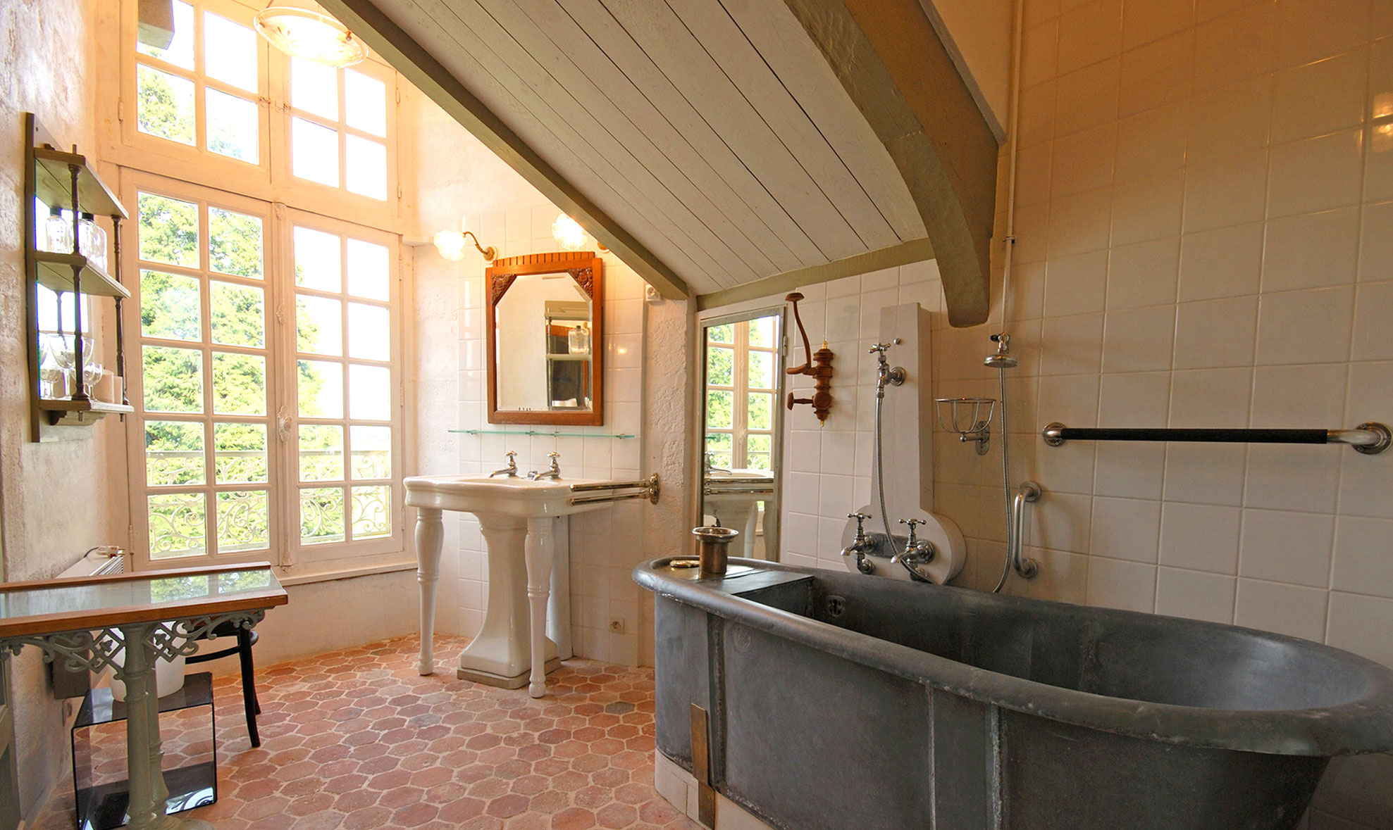 Le cabinet de toilette dans la tour ronde attenante possède une baignoire en zinc, une douche, un lavabo et un wc, (Sèche-cheveux, miroir, serviettes, et produits de toilettes à disposition).